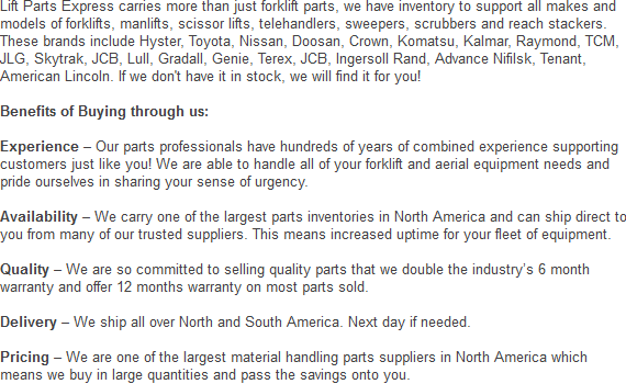 We offer you the best prices on all parts for your fleet of lift trucks. Phone today to get a price quote on one of the parts or attachments we offer. Call us at:
